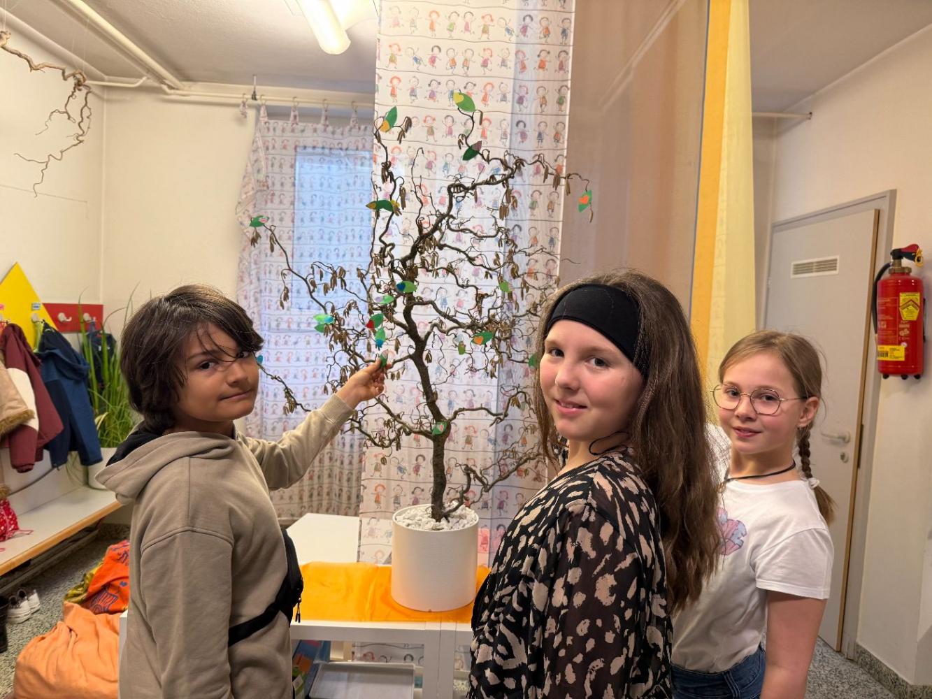Ein besonderes Highlight unserer Projektwoche sind die Klassenbäume, die in jedem Klassenzimmer stehen. Jeden Tag dürfen jene Kinder, die zu Fuß zur Schule kommen oder zumindest einen Teil des Weges selbst gehen, ein Blatt oder eine Blüte am Baum anbringen. So werden unsere Bäume von Tag zu Tag grüner und bunter – ein sichtbares Zeichen für das große Engagement unserer Schülerinnen und Schüler.