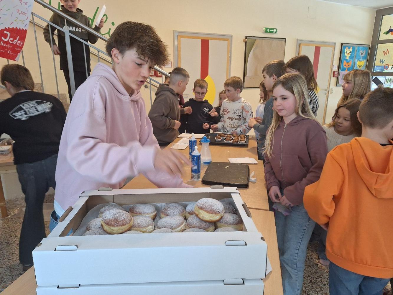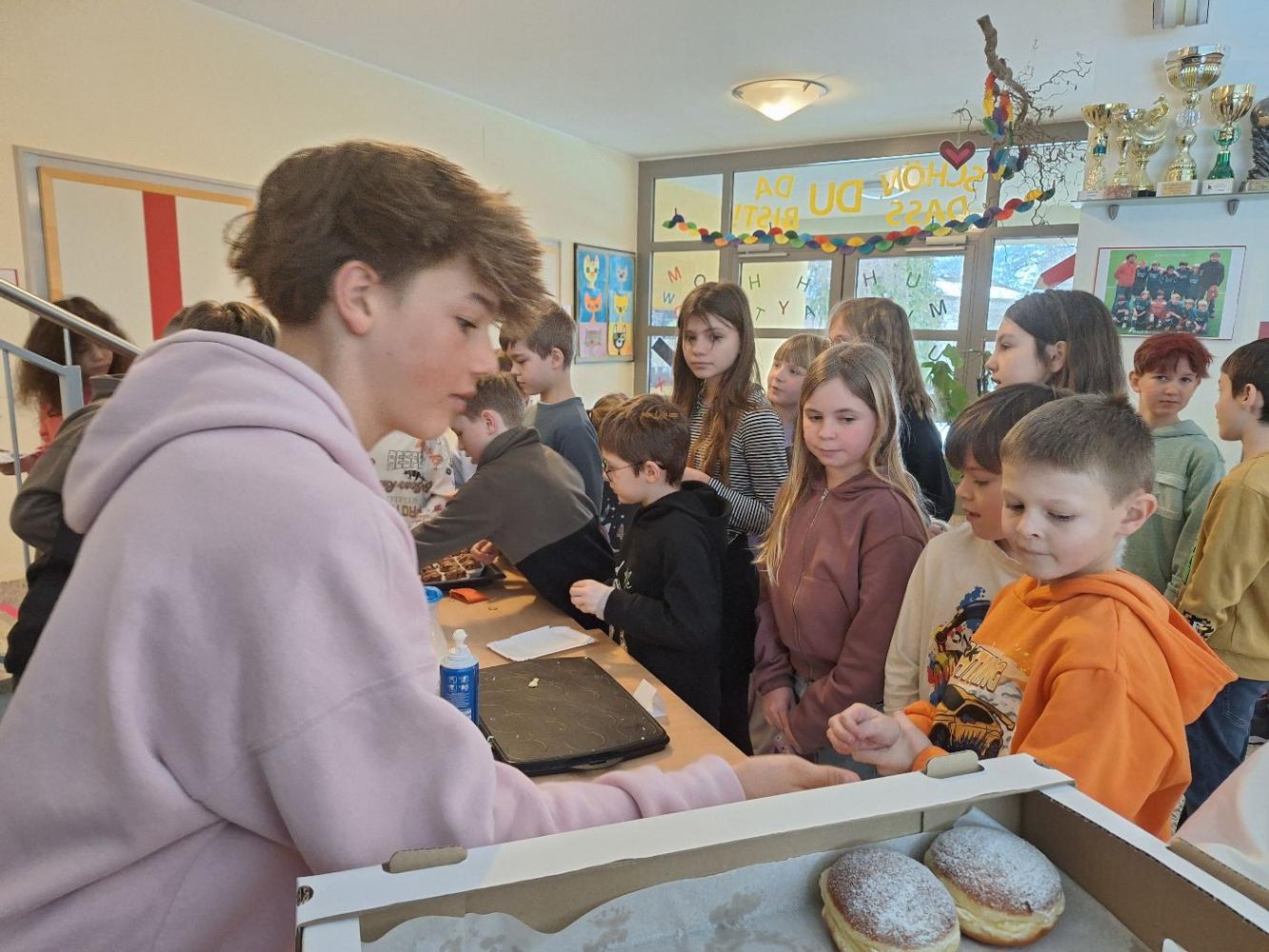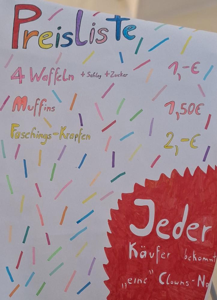 Eine besonders schöne Überraschung bereiteten einige engagierte Mittelschülerinnen und Mittelschüler unserer Schule am Rosenmontag: Mit viel Einsatz organisierten sie eine liebevoll gestaltete Jause mit frisch gebackenen Waffeln, köstlichen Faschingskrapfen und – passend zum närrischen Treiben – fröhlichen roten Nasen als kleine Draufgabe.